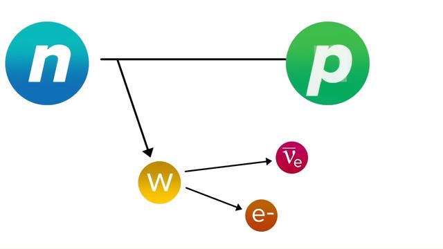 那么,既然这个方程结构控制着两种相互作用,而且它们的费曼图非常相似,那么究竟是什么差异使得弱力比电磁力弱得多?我们看到在这两种情况下传入和传出的粒子是相同的,所以它们不可能是差异的来源。顶点项中包含相互作用的电荷,但是如果我们实际计算弱力电荷和电磁电荷,我们会发现它们的大小非常相似。现在我们只剩下载力粒子这一项,它就是解释弱力太弱的原因,但它是如何发生的呢? 为了迈出下一步,我们需要谈谈海森堡测不准原理,这是量子力学的原理之一。人们常说这意味着你不能同时测量粒子的动量和位置,但不确定性原理还有另一种表达方式,即如果你观察一个粒子的时间越短,你对粒子能量的测量就会越不精确。而且,由于能量和质量通过爱因斯坦质能方程联系在一起,这意味着粒子的质量也可能与预期的不同。 基本上这就是说,虽然光子的质量为零,但如果光子参与的相互作用时间很短,那么在那一瞬间,光子可能有质量。同样,Z玻色子的标称质量为 91GeV/c²,但其实际质量可能会因非常短暂的相互作用而有所不同。事实上,我们对Z玻色子已经研究得很透彻了,我们知道它的质量确实有一个范围:在89.5到94.5GeV/c²之间。而这只是正常范围,任何特定Z玻色子的质量都可以介于0电子伏特和无穷大之间,但在正常范围之外发现它是非常罕见的。现在我们终于可以回答为什么弱力如此弱的问题:它归结为能量。 使用弱力的放射性衰变类型称为β衰变:中子衰变成质子并发射电子和中微子。这种衰变的一个例子是碳14衰变,它被用来确定一些物体的年龄。如果你更深入地观察它,你看到的本质上是中子发射一个W玻色子,然后它衰变成一个电子和一个中微子。我们可以计算出这个特定的W玻色子的质量必须为0.002GeV/c²。