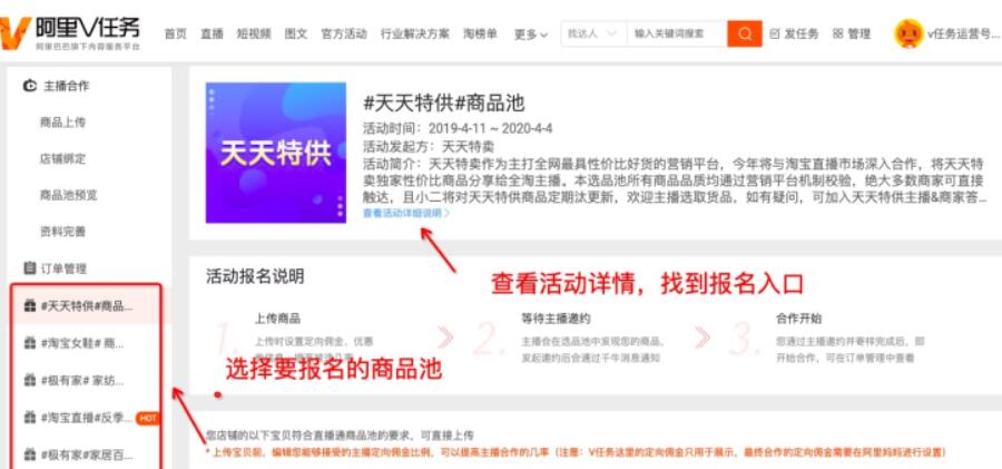 卖家用自己的账户登录到淘宝直播后台中,然后入驻V任务平台,绑定过V任务运营号,完成这些操作之后进入到下一步操作中,这时候需要卖家先报名参与淘宝营销系统的活动,申请活动权限,每个活动的报名入口都会介绍活动详情的,卖家需要仔细查阅下,如下图所示: