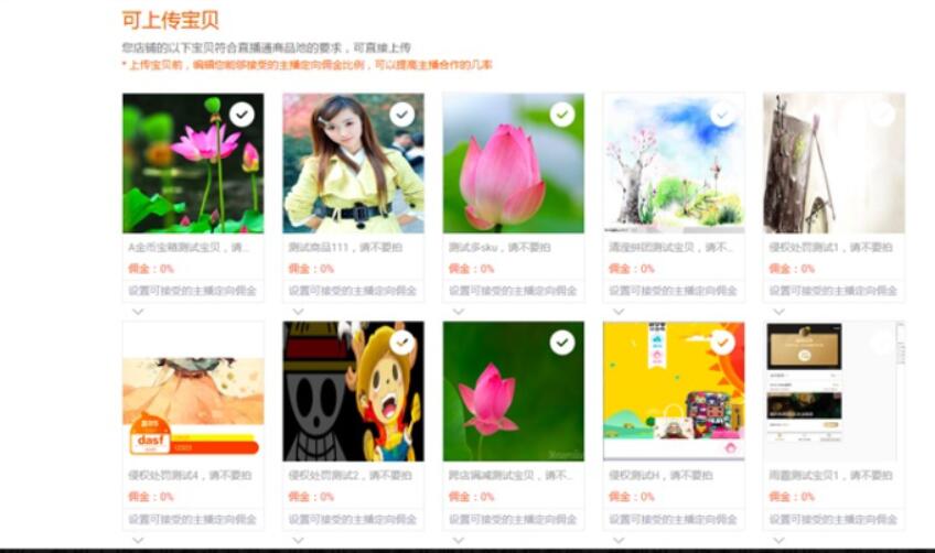 然后卖家对于要直播推广的商品进行勾选上传,这时候卖家用户还需要进行一项操作就是设置好主播的阿里妈妈佣金比例,设置完成之后,点击界面中的保存选项,等到上传成功之后,接下来就等待主播对产品进行挑选和主动邀约了,被主播选中之后,千牛系统会通知买家用户的。