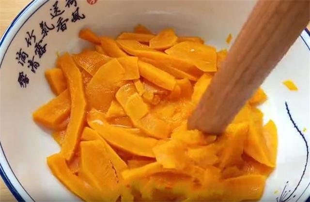 2.接下来我们准备400克南瓜,洗净去皮上锅蒸熟,也可以加一些白糖,按压成细腻的南瓜泥。