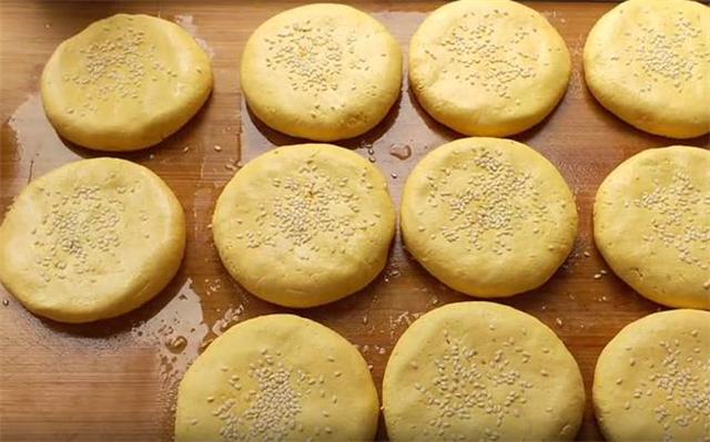 7.然后把每个面剂捏成薄的面饼,放入豆馅,捏合封口,然后把表面揉光滑按扁,这样我们的生坯就做好了。生坯的底部一定要刷上一些油,防止与案板粘连,然后撒上一些白芝麻,手上沾少许的清水,按压紧实,防止芝麻掉落。