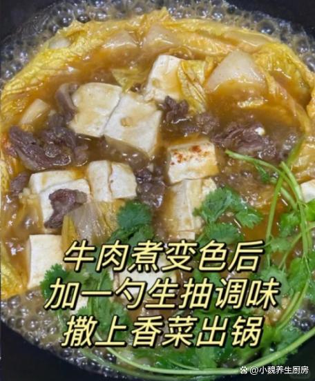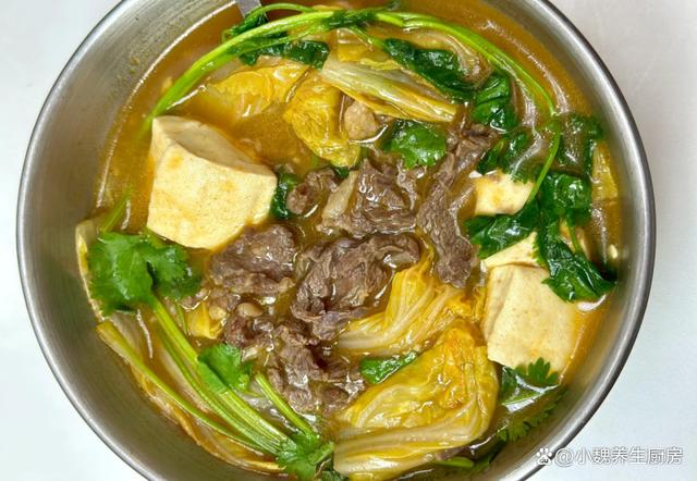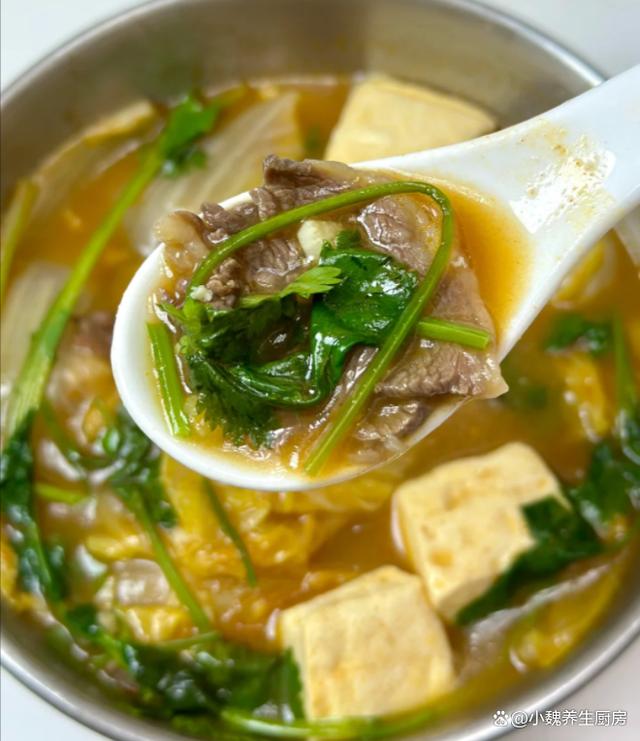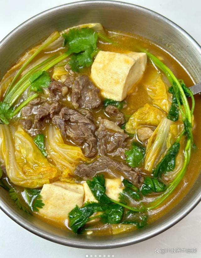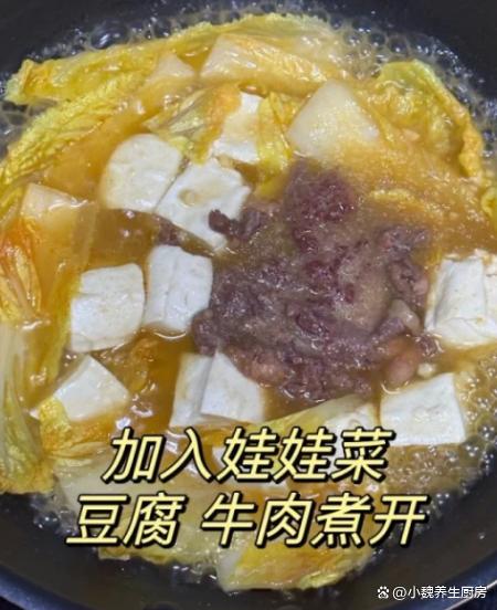 转眼时间,就已经来到了六月份,自己又长大一岁,证明家里的孩子也长大一岁,孩子明年就要面临中考了,岁月不饶人,自己也越来越苍老了。面对年纪的增长,孩子也会随着增长,孩子的发育很关键,如果每天吃学校的饭菜,营养肯定跟不上,平常会多给孩子吃肉类,豆类和鸡蛋等食材。刚好是周末和小长假,上超市购买一大块牛肉,一小块豆腐,准备搭配娃娃菜制作一道美味的菜肴——娃娃菜牛肉豆腐汤,简单易学,小白都可以学会,赶快学起来吧。入夏后,建议要多喝这汤,简单易学,营养全面,孩子大人都爱吃。  【娃娃菜牛肉豆腐汤的具体做法】 食材清单:选购新鲜娃娃菜一颗(娃娃菜是一种口感清甜的蔬菜,非常受年轻人的喜欢,膳食纤维含量高,富含大量的水分和维生素,能够促进肠道的蠕动,起到刮油清肠的目的,可以凉拌,素炒或煮汤),选购新鲜牛肉里脊320克左右(牛肉里脊是牛肉身上的部位之一,肉质非常鲜嫩,口感特别好,能够做成各种美食),若干个大蒜头,几片生姜,一勺辣椒面,少许生抽,半勺蚝油,一勺玉米淀粉,食用油少许,清水少许,新鲜嫩豆腐一小块(豆腐是常见的豆制品,嫩豆腐的口感嫩滑,适合用来煮汤,为家里人补充营养),冷水少许,食盐和其他佐料,几根香菜,其他。 详细制作顺序:第一步:提前准备好娃娃菜,牛肉里脊和豆腐等食材,先把生姜切碎成细末,大蒜去皮切碎成蒜末,香菜洗净切成小段,备用。第二步:买回来的嫩豆腐用水泡一泡,然后冲洗掉表面的豆腥味,改刀切成若干小块,放在碗中备用。第三步:将牛肉里脊洗干净,去掉多余的部位,逆着纹路切成薄片,用手不停地摔打,或者用擀面杖敲打,这样让牛肉更有弹性。 第四步:牛肉片放在大一些的器皿里,加上少许生抽和蚝油,加上一勺淀粉,加上食盐半勺,加上葱姜水少许,滴入一些辅食油,用手抓拌均匀,腌制10分钟以上。 第五步:将锅底提前烧热,加上食用油烧热,加上蒜末和葱白,加上一勺辣椒面,快速煸炒一会儿。 第六步:加上一碗半清水煮开,分别下入豆腐和娃娃菜,稍微煮几分钟,下入腌制入味的牛肉,让牛肉煮至变色。