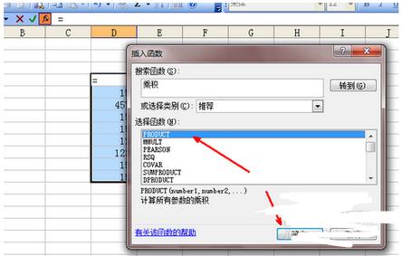 6.开始计算第一组数据的乘积。直接用鼠标选定刚才选定的那组数据,选定之后这组数据会被虚线包围,然后在函数参数框中会有显示这组数据,同时在最下面会有一个计算结果,如图。