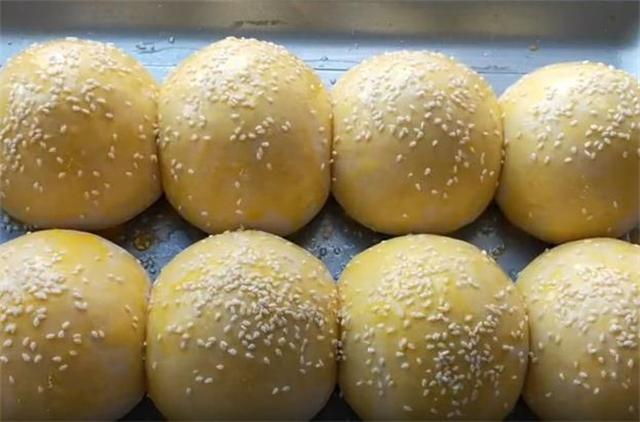 7.烤盘底部刷油,放入生坯,盖上保鲜膜二次醒发15到20分钟,然后刷上食用油,撒白芝麻。