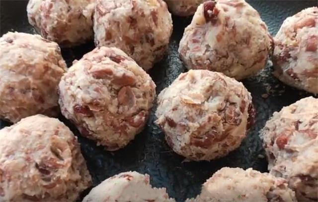 4.然后我们可以加一些白糖,不喜欢的也可以不放,用擀面杖把它按压成泥,然后趁热把它搓成大小适当的圆球备用。