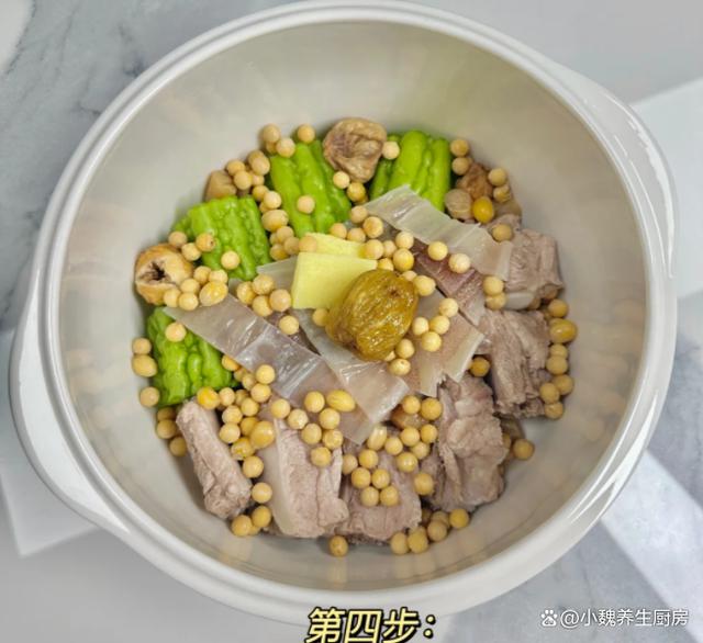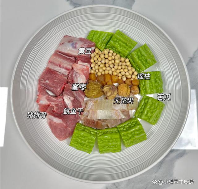 时间过得特别快,一晃眼就到了六月份,感觉一年就要过去一半了,夏季也终于来临了,我们要面对炎热天气的考验,炎热的天气非常容易出汗,很多人会出现中暑,还特别容易上火,整个人的抵抗力低下,很多疾病会钻空子,每天感觉吃啥都没有胃口。今天刚好是周末和小长假期间,准备给家里人制作一款家常汤品——苦瓜黄豆鱿鱼排骨汤,总共花费不到30块钱,经过慢火炖煮,汤品非常鲜美,赶快学起来吧。6月,苦瓜和它是绝配,每周喝几次,汤品鲜美,补足营养顺利度夏。  【苦瓜黄豆鱿鱼排骨汤的制作技巧】 选购一些食材:选购新鲜苦瓜一根(苦瓜又叫癞瓜或凉瓜,是夏季最受欢迎的蔬菜之一,小时候不爱吃苦瓜,父母说吃得苦中苦,才能做人上人,小时候非常讨厌苦瓜,现在年纪大了,反而喜欢吃苦瓜,苦瓜有一点点苦涩,吃起来非常脆爽,荤素都可以搭配,夏季可以凉拌或炖汤,多吃能够清热泻火,排出身体的毒素),选购一条干鱿鱼,黄豆一小把,选购新鲜猪排骨一斤左右(也可以选择筒子骨或脊骨,排骨价格价格虽然贵,但是我们家里人都爱吃,营养价值也很高,煲汤是最佳吃法),冷水和温水少许,一大块生姜,香葱若干根,冷水和温水少许,几勺料酒,食盐若干,其他佐料。 详细制作顺序: 步骤1:提前选购好苦瓜,黄豆,鱿鱼和排骨等食材,买回来的苦瓜要处理,切掉头尾部分(两头是苦瓜最苦的部位),从中间对半切开,挖掉里面的黄色部分,洗净切成若干块状,苦瓜也可以用清水或盐水浸泡,也可以去掉部分苦味。步骤2:将鱿鱼干放在容器里,加上适量温水和小苏打,将鱿鱼干泡发变软,撕掉一层黑膜,洗净切成若干块状,放在碗中备用。 步骤3:将黄豆清洗干净,黄豆用冷水泡发变软,生姜切成若干片状,香葱洗净打成葱结。