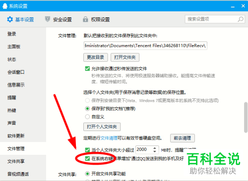 6. 在右侧打开的页面,找到【在系统右键菜单中增加“通过qq发送到我的手机及好友”】的选项,最后在其前面打上勾即可。