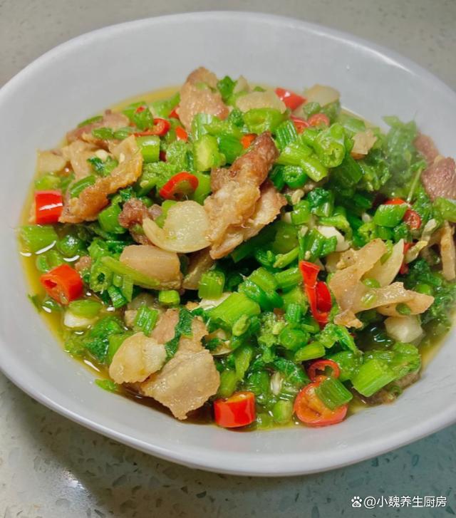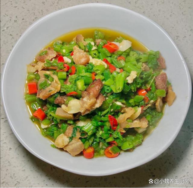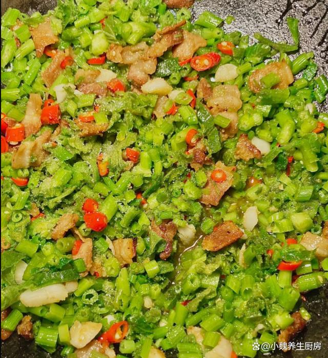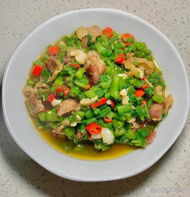 步骤6:加上少许生抽和蚝油,加上鸡精,胡椒粉和食盐,翻炒均匀,装盘出锅,这道南瓜藤炒五花肉就制作完成了,夏季一定要尝一尝这道菜。 南瓜藤炒五花肉的制作小贴士:首先,挑选南瓜藤时,要选那些颜色鲜绿、叶片饱满的,这样的南瓜藤口感更加鲜嫩。同时,五花肉的选择也很关键,要选肥瘦相间的五花肉,这样炒出来的菜肴既不会过于油腻,也不会过于干涩。 其次,在处理南瓜藤时,要将叶片和藤茎分开处理。叶片可以切成小段,藤茎则要去掉外皮,切成小段备用。这样可以确保在炒制过程中,叶片和藤茎能够均匀受热,口感更加一致。在炒制过程中,火候的控制也至关重要。一开始可以用中火将五花肉炒至微黄,炒出油脂,然后转大火加入南瓜藤翻炒。大火翻炒可以迅速锁住南瓜藤的水分和营养,使其口感更加鲜嫩。此外,调味料的添加也要适量。过多的调味料会掩盖南瓜藤本身的清香,而过少的调味料则会使菜肴显得单调无味。因此,在调味时,要根据自己的口味和需求来适量添加。 南瓜藤炒五花肉是一道特别美味的菜肴,南方人基本上天天吃,南瓜藤非常不起眼,深受很多年轻人追捧,吃起来清爽解腻,搭配五花肉是绝配,吸附猪肉的油脂,爽口开胃,再也不用担心家里人没有胃口了。 摘自: www.ws46.com 网友们,你们是否吃过这道南瓜藤炒五花肉呢?(文中的配图都出自网络)