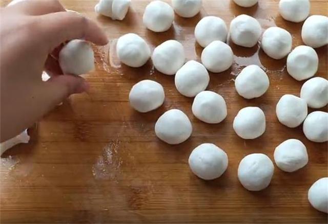 2.揉成柔软光滑的面团,直接放在案板上搓成长条,我们在揉的过程中肯定会粘手,所以说可以手上沾一些食用油,然后把它分成小块搓圆球备用,这个圆球的大小和我们平时吃的小汤圆一样大就可以。