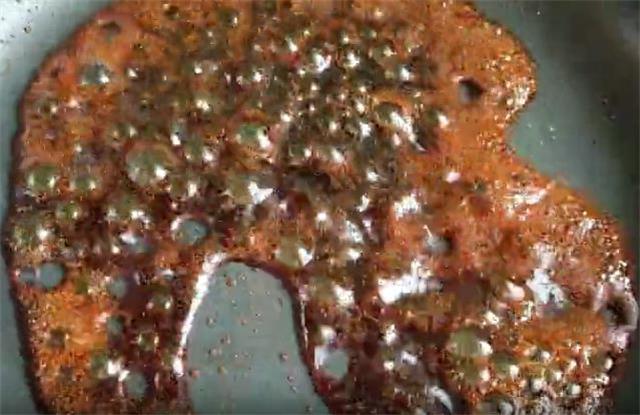 5.四川糖油果子的做法是果子飘起来微微变黄之后,直接在油中倒入红糖,炸过果子的油就会变甜,就没法用来炒菜,我们今天用水来代替,另起锅加入少许的清水,倒入红糖,由大泡变成小泡的时候,我们关火。