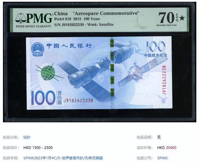在近期有一张2015年的蓝色100元纸币,拍出了20000多,这种蓝色纸币是15年发行的航天纪念钞,它的面值是100元,是等面值兑换的,也能等值流通你有吗?由于发行量达到3亿张,当时不少人都兑换到了这张纪念钞。 也因为面值和发行量都比较大的原因,它在发行之后就稳定在面值附近,即使是整刀的航天钞,单张也就几毛的溢价,只有号码不错的会受到藏友的追捧,比如常见的豹子号,就能让航天钞上涨几十。 但是近期有一张号码普通的航天钞,拍出了20400港币,这是为什么呢?最大的原因是这张纸市是PMG70分带黑星的评级币,70分已经是满分了,意味着品相完美无缺,而黑星则代表着纸币的品相在同分中出类拔萃。 这种品相的航天钞极为罕见,罕见到什么程度呢?根据统计一共是只有4张达到这个评分,因此这张完美的航天钞在号码普通的情况下,单张依然拍出了20000多,在同一场拍卖会中,还有一张PMG69分的航天钞,也拍出了1200。 大家可以看到品相出色的航天钞,比想象中要更为珍贵,此外我们也可以找找手中的航天钞,有没有不错的号码,即便是普通的双尾号它们也不再是面值了。 |