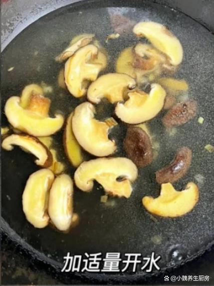 步骤5:将锅底调入食用油,放入姜末和蒜末爆香,倒入香菇片炒出水分,加上一碗半开水煮沸。