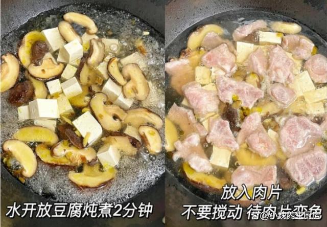 步骤6:然后放入一些豆腐块,下入腌制入味的肉片,将其烫至微微变色,调入少许味极鲜,鸡精和胡椒粉,食盐半勺,焖煮一会儿,撒上葱花即可,这款香菇滑肉豆腐汤就制作完成了。 (www.wS46.com) 香菇滑肉豆腐汤是夏季最受欢迎的汤品,基本上我们家每周必喝,为孩子提供丰富的钙质和蛋白质,汤品也特别鲜美,营养更容易消化,老少皆宜,赶快学起来。