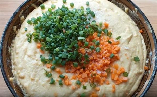 2.经过一晚的发酵,这个时候面糊如果有酸味,我们可以加少许的小苏打来中和酸碱,然后在发好的面糊中加入胡萝卜丁、葱花和盐,注意这个盐一定要后放,如果先放的话会影响面糊发酵,搅拌均匀排气备用。
