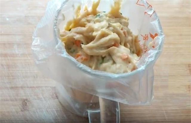 3.然后把搅拌好的面糊倒入裱花袋中,当然也可以直接用勺子。