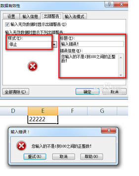 5.第三个是【出错警告】选项卡,我们在这个界面可以设置一旦表格使用者录入了不允许输入的值,表格将弹出警示框提示,同时取消录入的内容。