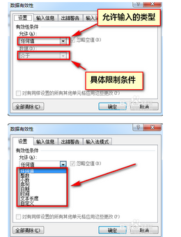 3.数据有效性设置的第一个选项卡是【设置】。 在【设置】选项卡可以设置“允许”输入数据的类型,并在“数据”处具体设置输入限制的具体规则。“允许”输入的数据类型也有多种格式。