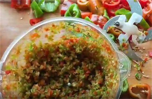 3.然后把切好的辣椒段放入搅碎机中,搅成小一点的颗粒,个人建议颗粒不要太大,之所以叫辣椒沫,就是因为搅得特别细碎,这样味道才能充分的释放。