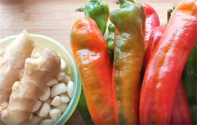 1.今天和大家分享一个东北特色辣椒沫的做法,我们这边每到秋季这种红辣椒下来以后,家家都会做一些,非常的开胃下饭。我们需要准备青红尖椒六斤,这种辣椒几乎没有辣度,特别适合做辣椒沫,生姜200克,大蒜500克,所有食材洗净控干水分。