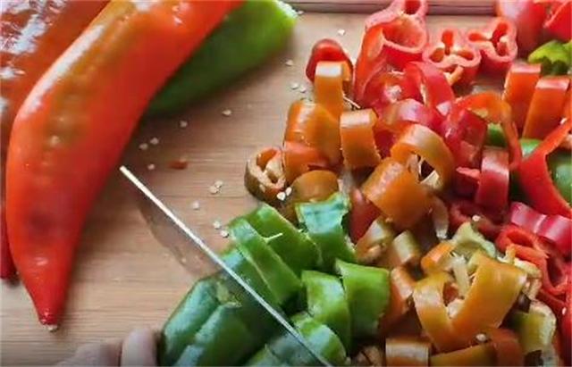 2.先把辣椒的蒂搁里面的籽去掉,防止影响口感,然后再把它切成小段备用。