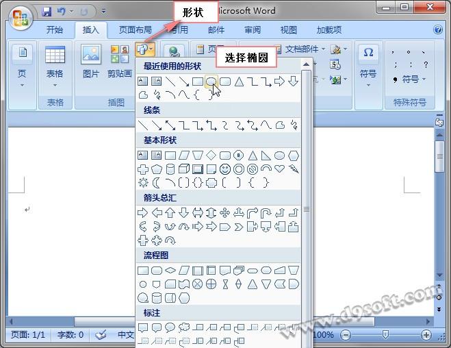 Word2007绘制公章具体步骤: 绘制圆: 首先在文档中插入一个椭圆。选择“插入”选项卡,点击“形状”,插入椭圆。