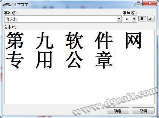 在弹出的窗口中输入文字,在本例中我们输入“第九软件网专用公章”,未免字体过于紧凑,我们在每个字中间加入了一个空格,然后选择确定。