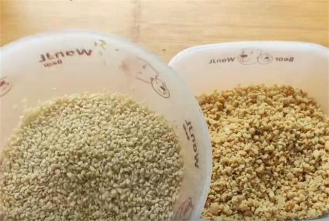 4.接下来把熟花生去皮擀碎,再准备一些白芝麻,生的熟的都可以,我用的是生芝麻。