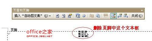 3、这时候会弹出“页眉页脚”工具框,我们把文档翻到第1页,并下拉文档到页码处(一般在页脚),然后后删除页码文本框,那么整个文档的页码就被删除了。见下图: