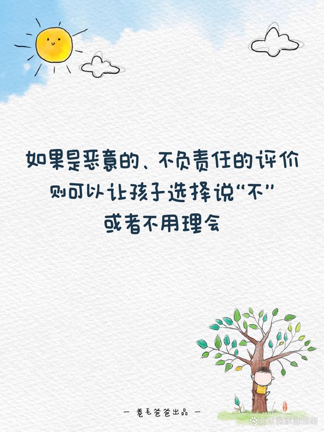 孩子来到这个世界上,每天都会面对来自他人的评价,有善意的、中肯的,也有恶意的和诋毁的。 如果评价是符合事实的、客观的,我们可以给孩子正向引导,鼓励孩子做出积极的改变。如果是恶意的、不负责任的评价,则可以让孩子选择说“不”,或者不用理会。 我建议还是找专业人士咨询解决这个问题,我就是这么过来的,孩子实在没法管教好,我们找的高途美好家庭,宋立老师是国家二级心理咨询师 ,专门针对青少年厌学和心理咨询,内容深入浅出,十分易懂,还能针对家长的不同问题提出不同的解决办法 。 关注私信我回复666即可获得:4天宋立老师亲子教育直播课程、领取海量家庭教育电子资料、而且会针对性分析孩子目前的问题,帮助家长科学快速解决! 作为父母在评价孩子的时候,也要注意科学性、多元化,对于孩子的优点、强项,要及时肯定、鼓励,对于孩子的缺点、弱项,不打击、不指责,要给出他具体的努力的方向。 孩子的成长过程中,没有比让孩子自信更重要的了,父母无条件的爱和接纳,永远是提升孩子自我价值感的最强动力。