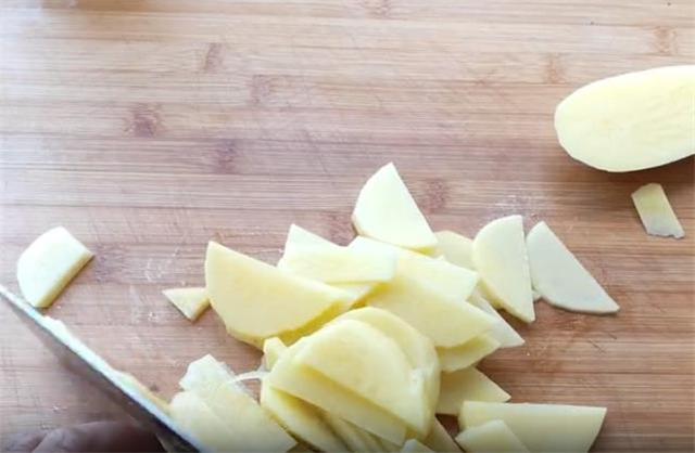 1.今天和大家分享一个15分钟就能做好的营养快速早餐饼。首先我们把一个稍大一点的土豆切成薄片,上锅蒸熟。