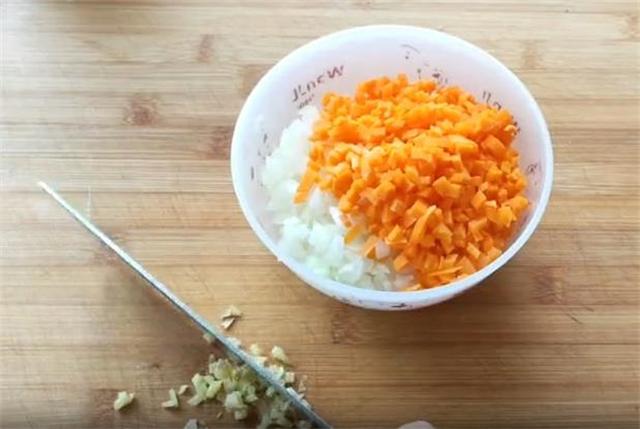2.再准备半颗洋葱,半根胡萝卜切成小丁,再切一点姜末。
