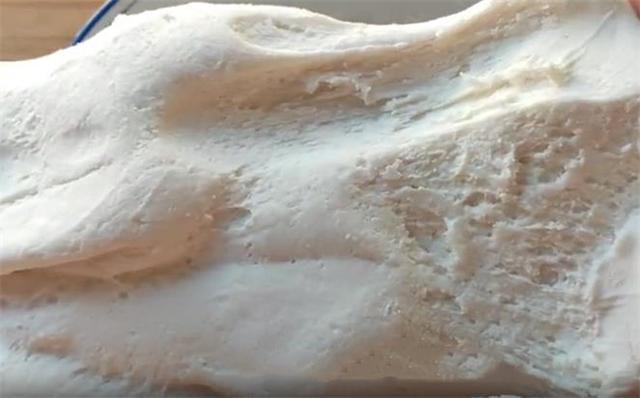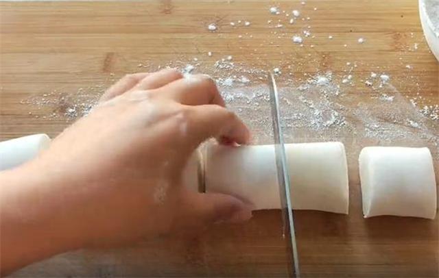 3.发好的面不用揉,直接把它搓成长条,分成小的面剂即可,我们之所以做炸糕的时候发面,就是因为发好的面表层有很多的小气孔,这样我们炸制的时候它才不容易开裂。