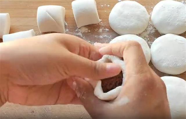 4.把面剂擀薄,包入馅料,封口按扁,这样我们炸糕生坯就做好了。