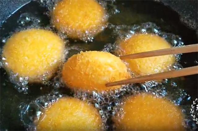6.重要的一点,油温3到4成热下入生坯,一定不要高油温下锅,这样能够使内外温度同时升起,这样也能够保证不开裂,炸至飘起时我们翻面,全程用小火反复翻面,大约炸5到7分钟左右,炸至表皮金黄定型即可出锅。