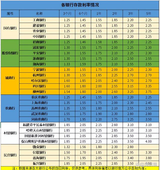 3、城商银行。城商银行的存款利率看起来就要更高一些,不过各城商银行之间的利率相差也比较大。其中存款利率较低的,与股份制银行差不多,而利率较高的就明显高于股份制银行。 目前利率超过3%的存款产品,在国有银行和股份制银行基本上是找不到了,而在城商银行却还有。比如上表中的四川银行和柳州银行,3年和5年期的存款利率都达到了3%以上,最高的可达到3.75%。 4、农商行。农商行的存款利率基本上与城商行相当,甚至整体上比城商行还稍微低一些。 当然,农商行也得看具体的银行,有的农商行存款利率也比较低,比如重庆农商行,存款利率已经向国有银行看齐了。而有的农商行则明显比较高,利率最高的可达到3.5%以上。