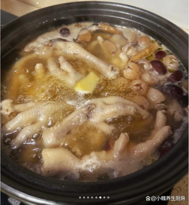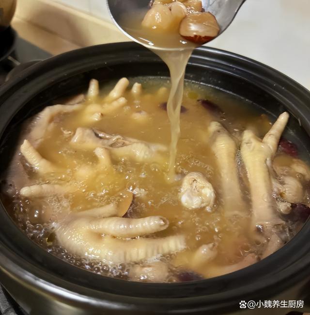 5:提前准备煲汤的锅,锅中放入党参,黄芪,当归,桂圆肉,红枣和姜片,放入焯水好的鸡脚,记得加上纯净水1000毫升左右。 6:大火先煮至沸腾,小火煲45分钟左右,记得要控制好火锅,让鸡爪煮至软烂,调入胡椒粉和食盐调味,继续焖煮几分钟就可以了。7:关火盛出开吃了,这款党参当归桂圆鸡脚汤就开吃了,经常贫血喝失眠的人,一定要尝尝这款汤品。 党参当归桂圆鸡脚汤是一款特别滋补的汤品,被称为“补血安神汤 ”,里面选用鸡脚,桂圆肉,党参,红枣等食材煲制而成,汤品鲜甜,滋补气血和肝肾,还能调理失眠的情况,对身体好处多多。你们是否学会这款党参当归桂圆鸡脚汤的制作技巧呢?(文中的配图全部出自网络)