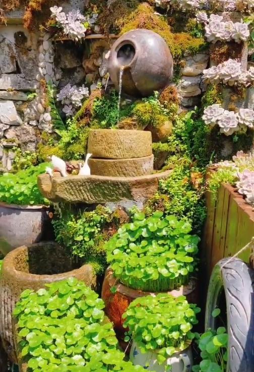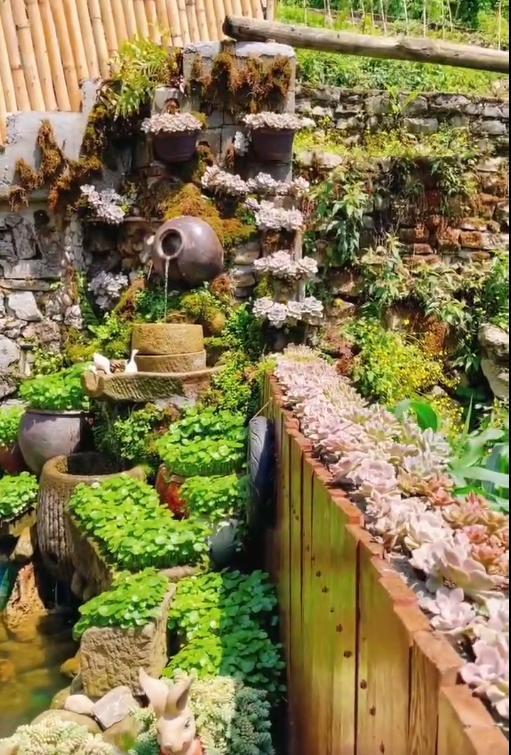 用石头堆砌了一面高低不等的墙,上面没有种植什么花草,但是很有艺术感,再在墙上放了一口倒过来的大水缸,将里面的水倒了出来。 此池之水,出壶之后,会落入下方的石槽之中,叮叮咚咚,滋润着金钱草与多肉,而后水满则溢出,流入下方的水缸,最终汇入下方的溪流之中。 如果身临其境,真的会让你叹为观止的,先不去看栽培的技艺,单单是这些创意,可不是一般人能设计出来的,自身的艺术修养也不会差了。