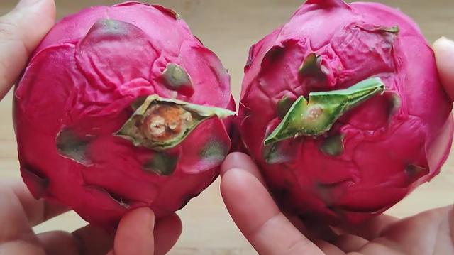 四、观察果丁,判断采摘时长。果丁处的切口可以反映出火龙果的采摘时长。如果摘口处干燥且有发黑发黄的颜色,说明采摘、运输或售卖的时间过长,水分流失会影响口感和保存。因此,在挑选火龙果时,我们要选择摘口处新鲜、颜色正常的火龙果。