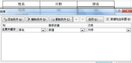 最后,弹出一个主要关键字排序,选择”排名“、”数值“和”升序“,