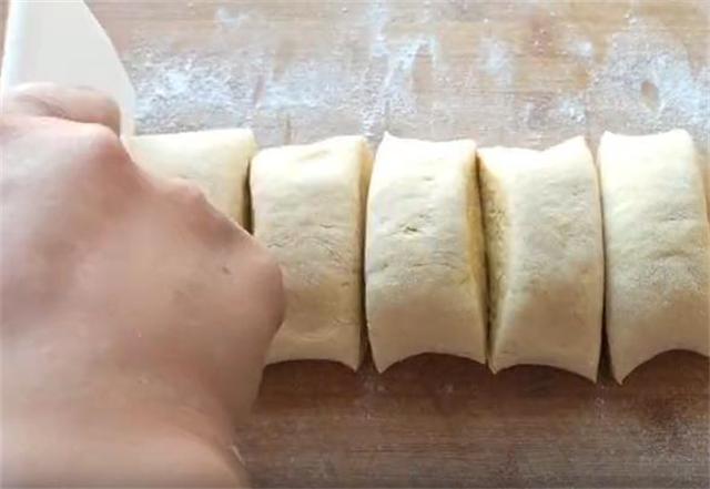 3.接下来把发好的面放在案板上揉搓排气,案板上撒点干面粉,多揉一会儿,排尽里面的气体,这样做出来的口感会更加细腻,然后把它搓成长条,分成8份。