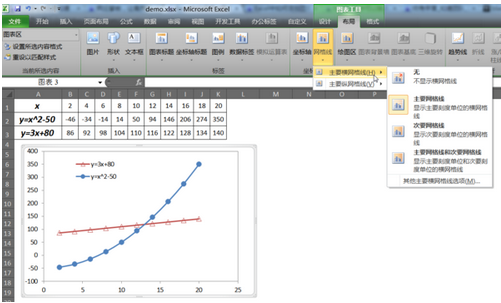 2、Excel 2007及以上:选中图表→图表工具→布局→网格线