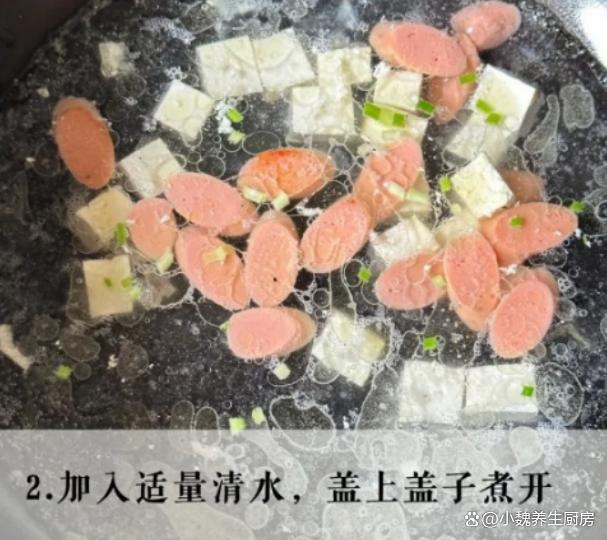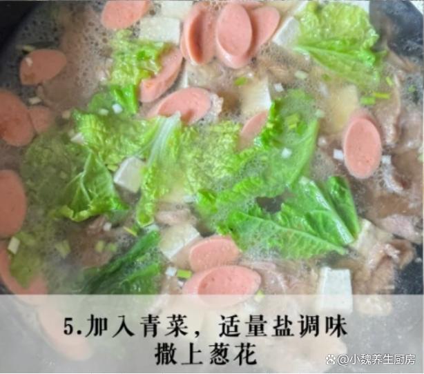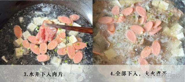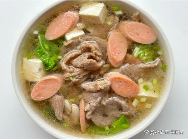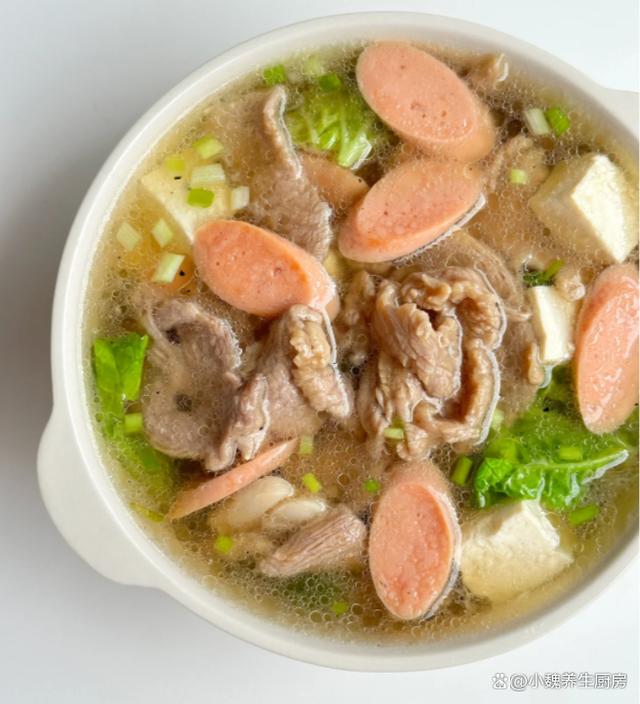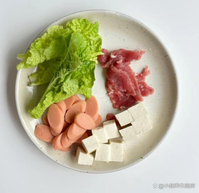 具体制作过程: 1:提前准备好火腿肠,豆腐,青菜和猪肉等食材,先把豆腐泡在水中,豆腐有一些豆腥味,然后切成若干小块,也可以焯水处理,备用。2:将火腿肠的包装纸撕掉,然后切成若干薄片,几片生姜切成细丝或细末,小生菜去掉根部,叶子反复清洗干净,控干水分即可。3:将猪肉去掉多余部位,顺着纹路将猪肉切片,肉片要尽量薄一些,肉片也可以用生姜水泡一泡,这样能够减少腥味。4:肉片放在器皿里,加上一些葱姜水和料酒,加上少许生粉增强口感,加上食盐和其他佐料,将肉片快速抓拌均匀,腌制入味。