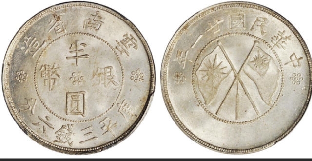 双旗币就是民国时期比较重要的一种钱币,很多版的钱币后面都是用双旗来作为图案,也有很多军阀的纪念币也是用这种双旗的标志来作为钱币的图案,可想而知双旗当时在民国时期的地位是非常高的一种形式,也可以认为它们就是那个时候的象征吧就好像我们的五星红旗一样。一般情况下银质的双旗纪念币的收藏空间都是比较大的,我们在民国双旗币里面能看到两种云南造的双旗币,这两种双旗币其实也是属于特定地方的流通的钱币,它们分别是唐继尧和云南半圆这两种双旗币。