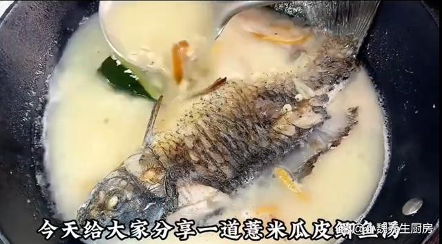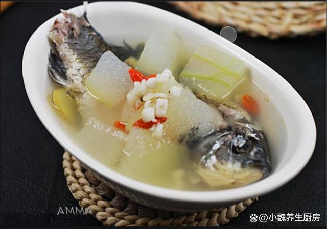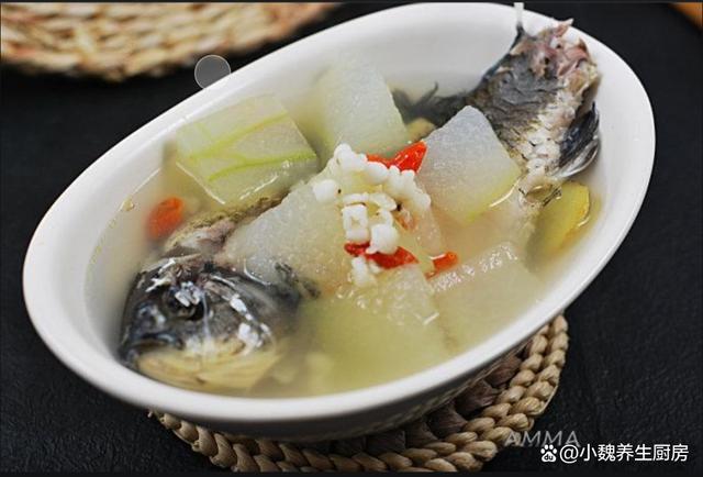 5:将冬瓜的外皮洗净,去掉冬瓜的内瓤,切成大小相同的块,准备好鲫鱼,薏米和冬瓜等食材,开始制作这道冬瓜薏米鲫鱼汤。 6:提前把锅底烧热,冷锅热油烧热乎,撒上少许食盐,将鲫鱼下锅煎一煎,两面都煎至金黄。 7:加上两大碗开水,放入冬瓜块和薏米,放入一些生姜和陈皮,小火炖煮5到6分钟,让鱼汤煮至奶白色。 8:最后加上一丢丢胡椒粉和少许食盐,将汤汁煮至入味即可,丢入葱花和枸杞子,焖煮一小会儿,出锅开吃,冬瓜薏米鲫鱼汤就制作完成了。 冬瓜薏米鲫鱼汤是一款祛湿的汤品之一,深受很多南方人的喜爱,选用新鲜的鲫鱼,薏米和冬瓜,薏米和冬瓜都是祛湿的好帮手,搭配鲫鱼煮一锅,汤品实在是太鲜美了,喝起来巨舒服,暖心暖胃,赶跑身体的湿毒,让人身体更加健康。 网友们,你们是否喝过这款冬瓜薏米鲫鱼汤呢?(上述配图均出自网络)
