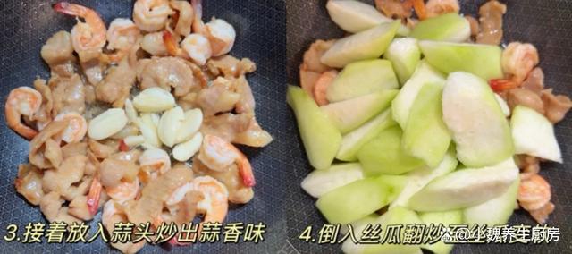 第五步:锅底提前烧热乎,加上食用油少许,油温烧热以后,放入腌制好的肉片,快速将其炒至变色,将肉片推到一边。 第六步:倒入腌制好的虾仁,将虾仁煎至变色,放入一些姜末和蒜片,最后倒入丝瓜块炒至变软。