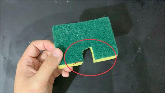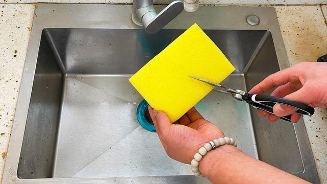 第二个妙用是关于百洁布的吸水性和沥干功能。我们知道,百洁布在清洗碗筷餐具时具有很好的吸水性。但使用后,尽管我们用手挤出了一些水分,百洁布里仍会残留一些污水。如果随意摆放,不仅不卫生,还可能成为细菌滋生的温床。此时,我们可以巧妙地利用百洁布上的缺口。将百洁布的中间剪掉一小块后,直接将其卡在水龙头上,这样可以让百洁布充分沥干水分,既方便又卫生。