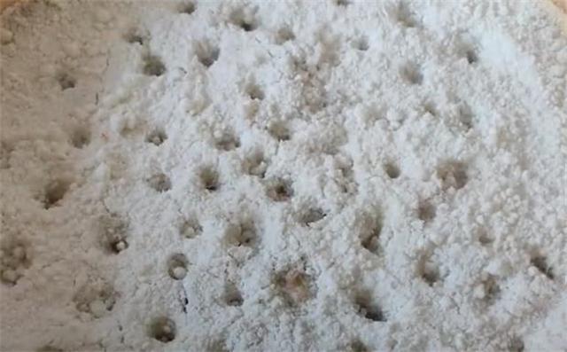 5.在撒的过程中,我们可以用筷子戳一些小眼来透气,这样防止夹生。