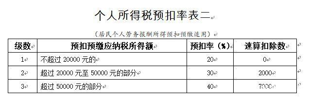 预扣预缴个税时,劳务报酬所得每次收入不超过4000元的,减除费用为800元;每次收入超过4000元的,减除费用按收入的20%计算;以扣除减除费用后的余额为收入额,预征率为20%——40%,具体预征率以及速算扣除数根据预扣预缴应纳税所得额(扣除减除费用后的收入额)所在区间,查表《居民个人劳务报酬所得预扣预缴率表》确认。