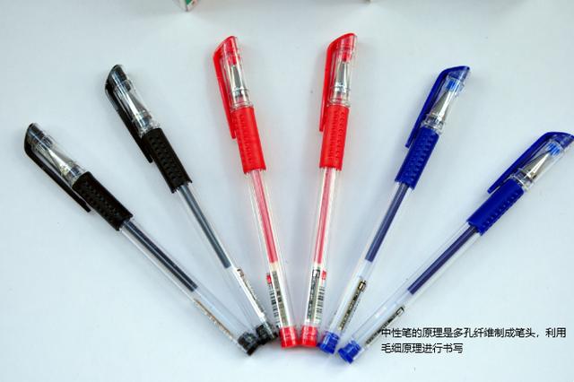 中性笔和圆珠笔的原理不同、笔头形状不同、笔芯不同、舒适度不同、遇水的性质不同、书写介质不同、表现力不同、字痕不同、字迹不同、气味不同。 原理不同 圆珠笔的原理是利用滚珠在书写时与纸面直接接触产生摩擦力,使圆珠在球座内滚动,带出笔芯内的油墨或墨水,以达到书写的目的。而中性笔的原理是多孔纤维制成笔头,利用毛细原理进行书写。