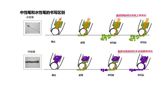 笔芯不同 圆珠笔和中性笔的笔芯内的物质性质不同,圆珠笔笔芯内是油性物质,中性笔笔芯内是水性物质。但中性笔的笔尖构造与圆珠笔基本类似。当储存在笔管里时是胶状的,但一旦书写出来,笔迹便是偏水性的。而圆珠笔用的墨是油性的,写起来是油滑的,对于书法的表现力非常有限。